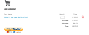 For most of standard items, clients can order online. for example, clients need M40x1.5 6g ring gauge. First : choose ” Metric thread gauge” from products menu, then reach page of Metric thread gauges Second:find M40x1.5, then reach page M40x1.5 thread gauge , then click the button “Add to Cart” , get the your shipping cart information,  Click the “Check out with Paypal”, then you can Pay by Paypal or By Credit card.
